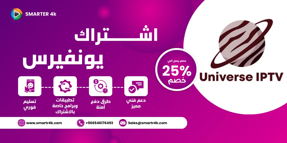 في الختام، يُعد اشتراك يونيفيرس خيارًا مثاليًا لمن يبحث عن تجربة ترفيهية متميزة ومتنوعة. مع مجموعة هائلة من القنوات ومكتبة ضخمة من الأفلام والمسلسلات، يوفر متجر IPTV سمارتر 4k محتوى يناسب جميع الأذواق. بالإضافة إلى ذلك، تضمن جودة البث العالية والواجهة السهلة الاستخدام تجربة مشاهدة سلسة وممتعة.