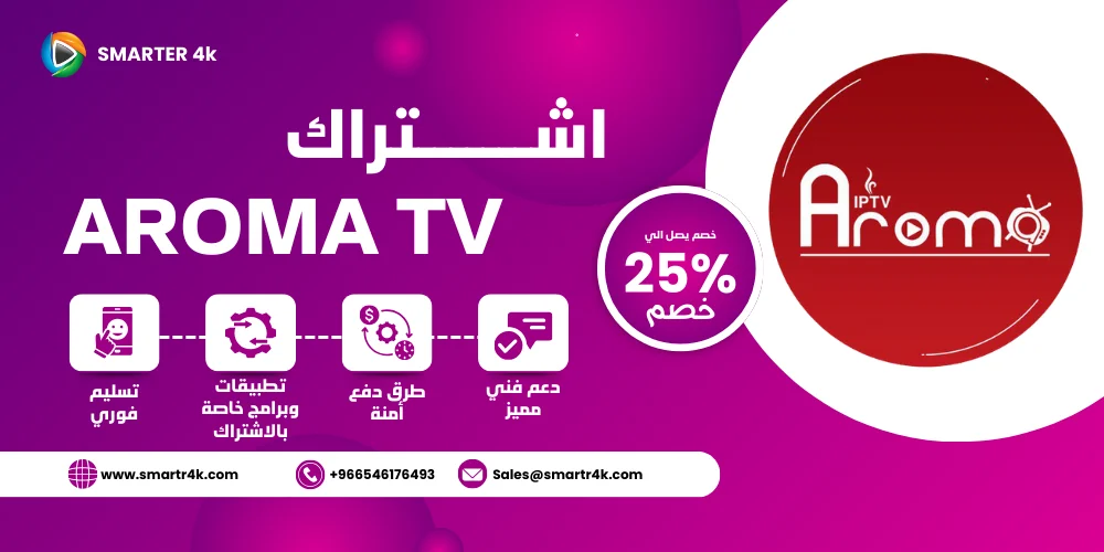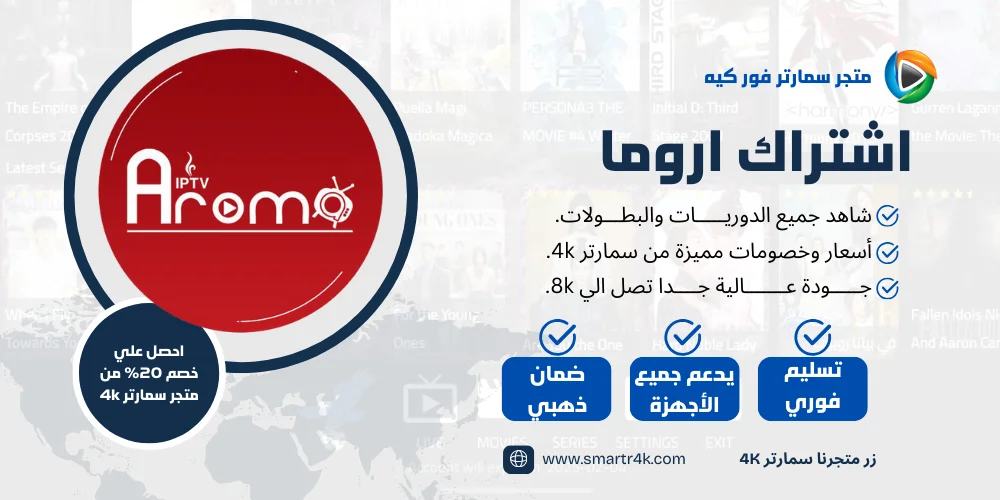 يوفر لك اشتراك Aroma IPTV أكثر من 10,000 قناة وما يزيد عن 20,000 فيلم ومسلسل. متجر Smarters 4K يقدم لك كود تفعيل Aroma IPTV بأسعار تنافسية، بالإضافة إلى روابط تحميل تطبيقات اروما وطريقة التشغيل. متجر سمارتر 4k يوفر لك أفضل اشتراكات IPTV بدون تقطيع بأفضل الأسعار ومن خلال هذه الصفحة يمكنك شراء اشتراك اروما بسعر مميز مع تسليم فوري للاشتراك، سنوضح لك كل هذه التفاصيل في السطور التالية.