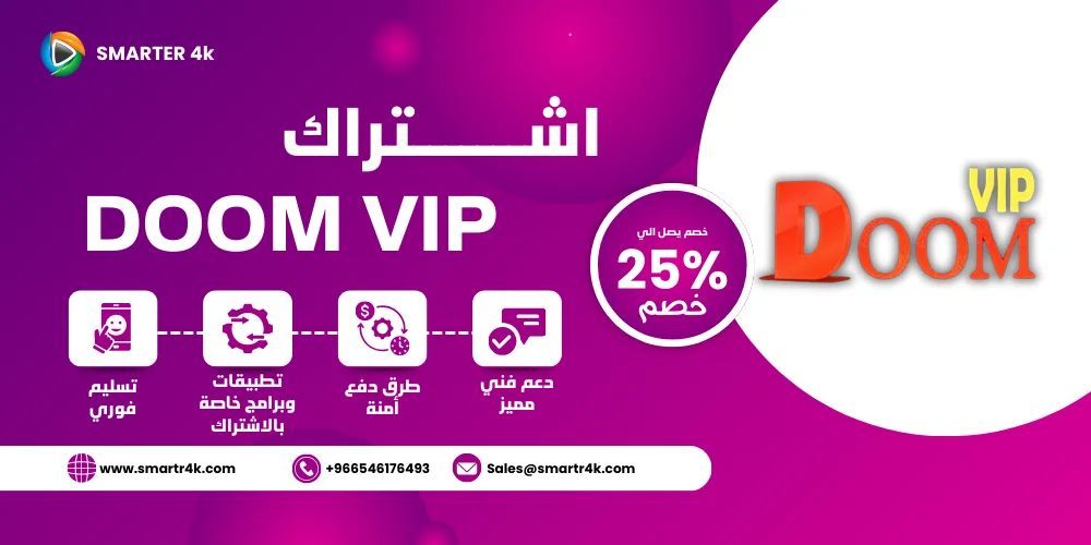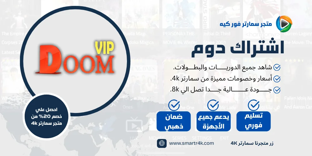 يوفر لك اشتراك دوم Doom IPTV أكثر من 10,000 قناة وما يزيد عن 80,000 فيلم ومسلسل. متجر Smarters 4K يقدم لك كود تفعيل Doom IPTV بأسعار تنافسية، بالإضافة إلى روابط تحميل تطبيقات دوم وطريقة التشغيل. متجر سمارتر 4k يوفر لك أفضل اشتراكات IPTV بدون تقطيع بأفضل الأسعار ومن خلال هذه الصفحة يمكنك شراء اشتراك دوم بسعر مميز مع تسليم فوري للاشتراك، سنوضح لك كل هذه التفاصيل في السطور التالية.