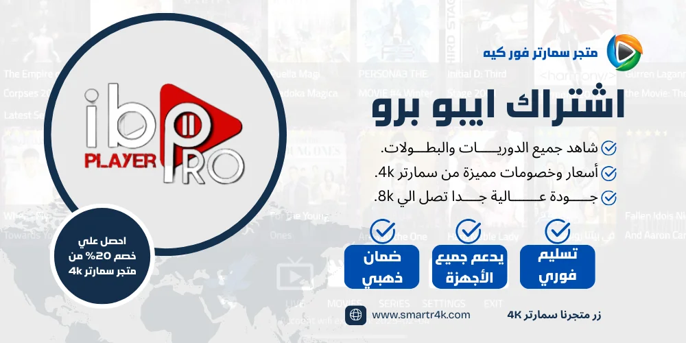 يوفر لك اشتراك IBO Player Pro أكثر من 12,000 قناة وما يزيد عن 40,000 فيلم ومسلسل. متجر Smarters 4K يقدم لك كود تفعيل IBO Player Pro بأسعار تنافسية، بالإضافة إلى روابط تحميل تطبيقات IBO وطريقة التشغيل. متجر سمارتر 4k يوفر لك أفضل اشتراكات IPTV بدون تقطيع بأفضل الأسعار ومن خلال هذه الصفحة يمكنك شراء اشتراك IBO بسعر مميز مع تسليم فوري للاشتراك، سنوضح لك كل هذه التفاصيل في السطور التالية.