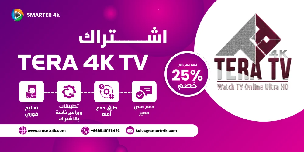 يوفر لك اشتراك Tera 4k Tv أكثر من 10,500 قناة وما يزيد عن 24,000 فيلم ومسلسل. متجر Smarters 4K يقدم لك كود تفعيل Tera 4k Tv بأسعار تنافسية، بالإضافة إلى روابط تحميل تطبيقات تيرا وطريقة التشغيل. متجر سمارتر 4k يوفر لك أفضل اشتراكات IPTV بدون تقطيع بأفضل الأسعار ومن خلال هذه الصفحة يمكنك شراء اشتراك تيرا بسعر مميز مع تسليم فوري للاشتراك، سنوضح لك كل هذه التفاصيل في السطور التالية.