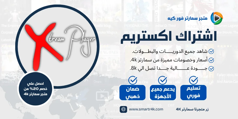 يوفر لك اشتراك Xtream Player أكثر من 9,000 قناة وما يزيد عن 22,000 فيلم ومسلسل. متجر Smarters 4K يقدم لك كود تفعيل التطبيق بأسعار تنافسية، بالإضافة إلى روابط تحميل تطبيقات Xtream Player وطريقة التشغيل. متجر سمارتر 4k يوفر لك أفضل اشتراكات IPTV بدون تقطيع بأفضل الأسعار ومن خلال هذه الصفحة يمكنك شراء اشتراك Xtream Player بسعر مميز مع تسليم فوري للاشتراك، سنوضح لك كل هذه التفاصيل في السطور التالية.